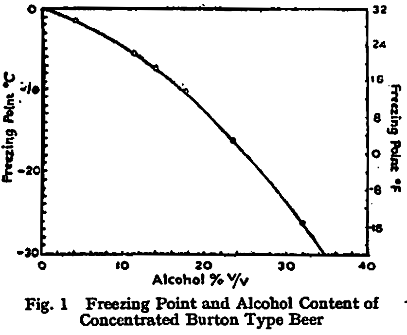 When dilute alcoholic liquors are cooled to temperatures below 0° C, ice crystallizes out and can be separated by means of a basket centrifuge from the liquid phase containing the alcohol and other solutes. As the temperature is lowered, ice-formation and the concentration of solutes in the liquid phase increase steadily, and the present work was undertaken to obtain data for the application of these principles to the preparation of concentrated beer.