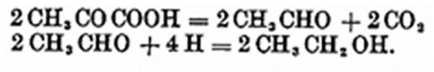 By the action of the carboxylase of yeast, pyruvic acid is decomposed into carbon dioxide and aldehyde, the latter being then reduced to alcohol.