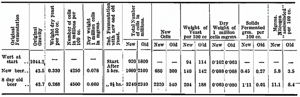 One litre of sterile hopped wort contained in a 2 litre flask was fermented to completion with a pure culture Scotch yeast at 70° F. The wort was analysed before fermentation, and again after fermentation. The flask was set aside at room temperature for eight days, after which time the contents were again analysed. The old yeast was then seeded into fresh wort, and as a control a fresh culture was at the same time seeded into a similar quantity of wort. Estimations of the number and weight of cells present, the nitrogen assimilated and the degrees of gravity fermented were made in the early stages. An examination of the yeasts was made at the commencement of this fermentation, and it was found that there were 4 per cent, dead in the fresh yeast and 20 per cent, in the old yeast. The figures given in the table are not corrected for those dead cells, because it was difficult to arrive at a suitable figure for their weight, and also because such a correction if applied would be in favour of the old yeast.