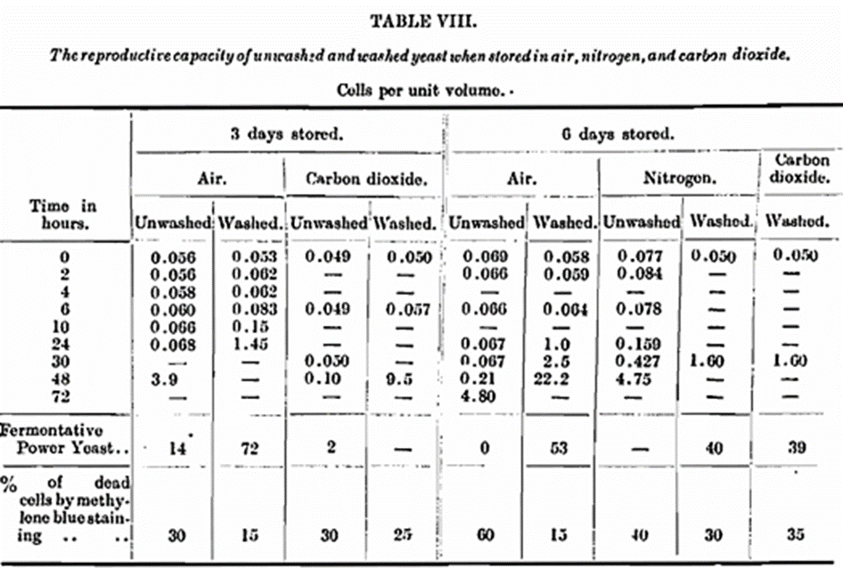 The subject of the oxygen requirements of yeast was a very controversial one. When they carried out the different storage experiments the yeast got any amount of oxygen because they passed moist air over it, so he did not see that it was of any moment, whether they washed the yeast with air free-water or not.