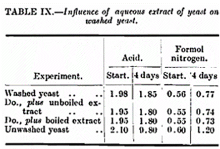 One of the earliest experiments was to prepare a strong aqueous extract of yeast. This was done by mixing equal quantities of yeast and water, standing half an hour and filtering through a Buchner funnel. The filtrate was again mixed with an equal weight of yeast and again allowed to stand for half an hour before filtering. This was done three times in all. The resultant solution was divided into two portions, one of which was left untouched, and the other one heated to boiling point and cooled. Some washed pressed yeast was then added and kept for 24 hours in contact with each of the two extracts. The yeasts were then pressed and along with blanks of washed and unwashed yeasts submitted to the usual storage test. The two treated yeasts behaved exactly as washed yeast (Table IX.), showing that the water-soluble matter from yeast when added back under the above conditions was without effect.