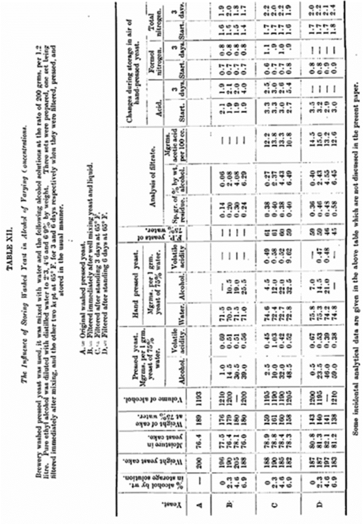 As a result of much preliminary work, it was decided to extract the yeast with alcohol (Sp. Gr. 0·827) using the solution so obtained for estimating the total acidity, “formol” nitrogen and “total” nitrogen. The yeast experimented on was always taken fresh from the brewery press and then pressed in cloth in a hand-press. This gave a white, “dry” crumbly yeast quite easy to manipulate. By washed yeast is meant brewery pressed yeast washed by suspending it in 10 times its weight of water, filtering through a Buchner funnel, with a slight extra wash on the filter, and then hand-pressing as before. It should be mentioned that if the yeasts are stored in the ordinary pressed state, that is without hand-pressing, results of a similar nature are obtained. The conditions of storage and the methods of analysis are given in detail in the appendix.