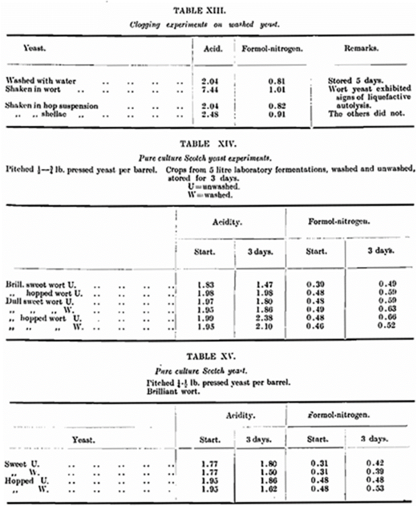Following this result further work on the influence of the fermentation medium seemed necessary. Accordingly, 5-6 litre fermentations of (1) dull hopped wort, (2) brilliant hopped wort, (3) dull sweet wort, and (4) brilliant sweet wort were carried out. Since sweet wort was being used it was necessary to ferment with pure culture yeast, so a large quantity of this was worked up in the usual way. The pure culture was isolated from the brewery yeast which forms the subject of the bulk of our work. The worts were pitched with about ¾ lb. pure (pressed) yeast per barrel. After 3-4 days the crops were collected and each divided into two portions, one was kept as unwashed yeast, the other was washed with water in the usual way. The standard storage of the eight yeasts was then carried out. The results were surprising, for the differences between the yeasts were negligible and, in all cases, they behaved as washed yeast. (Table XIV,). Other laboratory fermentations using pure culture yeast, gave similar results, while parallel experiments using brewery yeast as the pitching yeast gave crops which exhibited the now well-known washing effect. (Tables XV., XVI. and XVII.). The obvious conclusion to be drawn is that the peculiar property possessed by brewery yeast of autolysis when stored unwashed must be a cumulative effect due to the continuous production in presence of the colloidal substances of hopped worts. The pure culture yeast has likewise been through a great number of generations in wort of similar composition, except that it is always brilliant and therefore it might well be that the cumulative effect of the slight haze of brewery wort is the factor which has brought on this change. One experiment is not always sufficient evidence to prove any statement, but the fact remains that a laboratory fermentation with brewery yeast in very cloudy wort, and one in the same wort filtered brilliant produced yeasts which autolysed readily, but the one from the cloudy wort did so at a higher rate. Still, we do not mean to infer that the mechanism producing the cumulative effect of which we speak is simply of a clogging nature. Such an explanation would not fit all the facts, and moreover it is rather difficult to understand why a simple washing should completely remove the clogging material which was insoluble in the first place. It is a possibility, however, that contact with the yeast has effected some obscure change in this clogging material so that when amply diluted with water it forms a true solution.