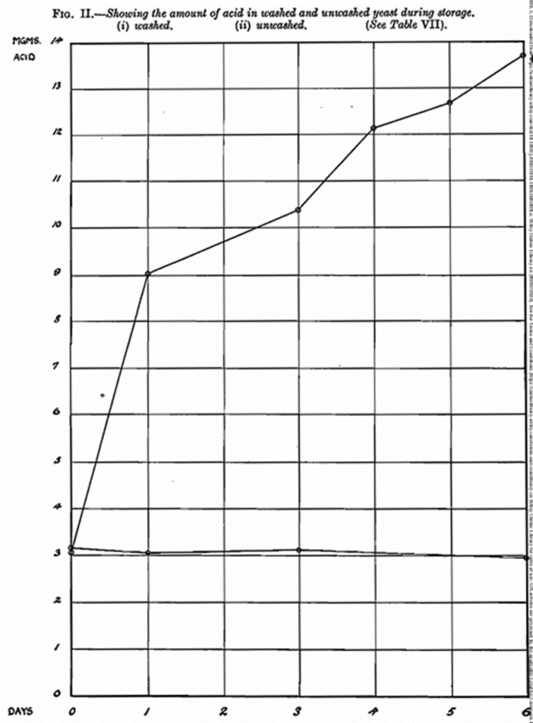 It has been shown that temperature has a decided influence on the enzymic changes of yeast during storage with the consequent development of a lag phase in growth. Considering that washing ordinary brewery yeast with water appears to retard the action of the enzymes responsible for these changes, and as the enzymes cannot be washed from the inside of the cells, the question arises as to whether the washing process removes the complementary substances. We know that washed and unwashed yeast have practically the same zymatic activity as measured in the Slator apparatus, but we have no experimental proof as to the activity of the endo-proteolysts. To prove the presence of the complementary substances of such enzymes is no easy matter but this does not preclude the possibility of their existence. From Tables IX. and X. it will be seen that adding an aqueous extract of yeast to washed yeast does not produce the autolytic effect noticeable during the storage of unwashed yeast in the pressed state, but this is not conclusive proof as the very act of diluting with water may be the means of destroying such substances if they were present. Similarly, as regards substances of a toxic nature these also might be destroyed during the aqueous extraction. That substances having a toxic influence on yeast are possible has been shown by Fernbach (Compt. rend., 1909, 149, 437-439) who prepared a weak acid extract of yeasts. Vansteenburge (Ann. Inst. Pasteur, 1917, 31, 601-630) found small quantities of tyrosine and leucine in pressed yeast, sub stances which he states are toxic to yeast. Other similar instances might be quoted showing that the deterioration during storage of unwashed yeast might be explained by the presence of toxic substances. We have prepared an extract by the method suggested by Fernbach from our yeast but found that it had no effect when added to washed yeast under our conditions of storage. Of course, it is not suggested that the above citations are exactly analogous to the issue at present under discussion. The toxic substance which we suggest as being a possible cause of the rapid deterioration of unwashed yeast is not necessarily a by-product of fermentation or yeast degradation, but is in fact more likely to be inherent to brewery yeast, such as a substance abstracted by the yeast from wort and in loose combination with some constituent of the yeast and which might be readily destroyed by mere dilution with water.