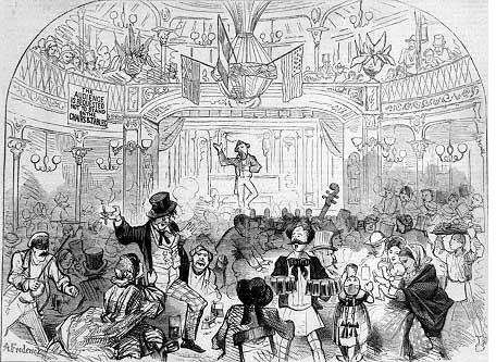 Although German immigrants did not mix politics and liquor, reformers were disconcerted by the atmosphere of their social establishments. Unlike the bars in Irish neighborhoods, the beer gardens catered to whole families. As this 1859 engraving shows, public drinking was only one attraction at a beer garden; but to reformers the presence of women and children suggested immorality.