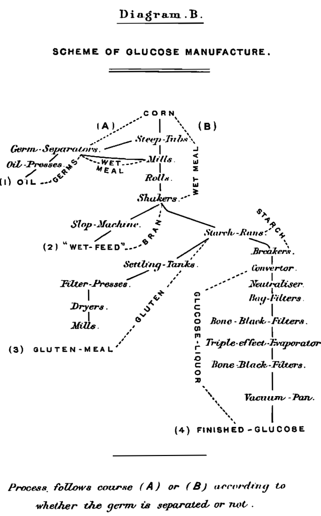 The time at our disposal will permit only the most superficial description of the manufacture of brewing-sugars. In general the process consists of three parts : (1) Separation of the starch; (2) conversion; (3) refining. (The diagrammatic scheme before you (B) will assist you in following this description.) All kinds of what is known as No. 3 or 4 corn (maize) are used,—the market being the main consideration. This corn is taken from the cars or the elevator of the works to the steep-tubs, which hold 2,000 bushels or more. In steeping, water at 150° F. is used at first, then the steep is allowed to cool till a temperature of about 90o F. is reached. Sulphurous acid is used to prevent putrefaction and assist softening. The steeping lasts 3—5 days. The separation of the starch consists of (1) grinding the wet grain, mixed with water, and softened by steeping; (2) separating the starch-grains from the woody fibre and germ by washing through sieves of bolting-cloth, rapidly shaken; (3) settling out the starch from the gluten by subsidence while passing over gently inclined runs (“tables”). The grinding is done so that the starch-grains are set free but not ruptured, an important point when yield is considered. The germ is removed separately, in many factories, by a patented process. This is accomplished by coarse grinding, and running the grain, mixed with much water, through a long trough, the mass being agitated slowly. The germ, which floats, is carried off by one channel, the rest of the grain by another. This separation of the germ is an important improvement, since the oil which is contained in it can be readily obtained as a by-product, and the quality of the glucose is much improved by its removal. The grain from the separators is ground and washed on the sieves (“shakers”) in the usual manner, and the separated liquor sent over the runs. The thin, highly diluted gluten is allowed to settle, pumped through filter-presses, and the dried cake, which contains over 30 per cent, of protein, sold for cattle-feed.