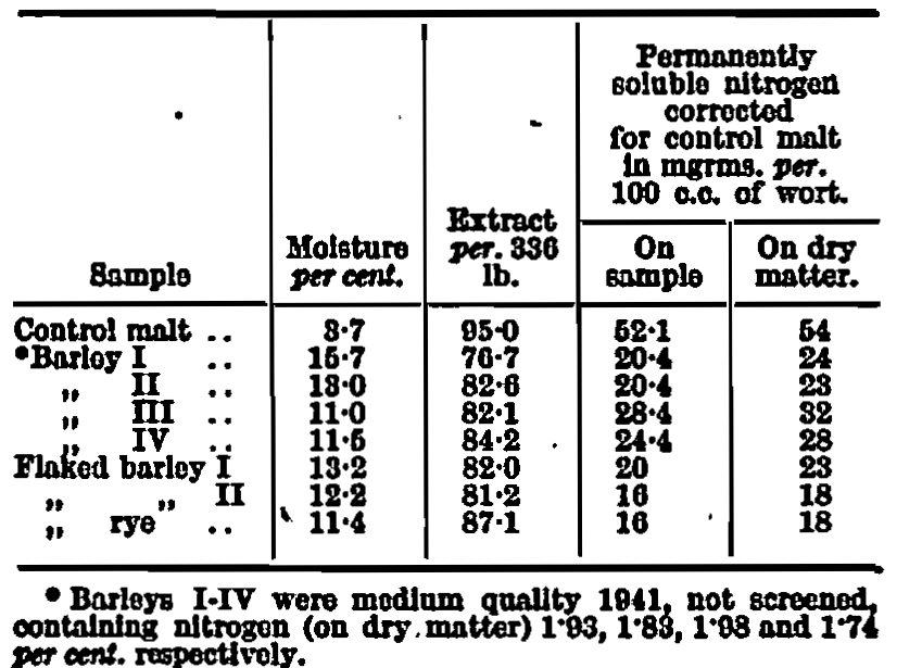 For purposes of comparison, figures for specimens of flaked barley from two makers and one of flaked rye are included. The permanently soluble nitrogen does not differ greatly from raw barley, but the extract obtainable from flaked rye is higher than from flaked barley.