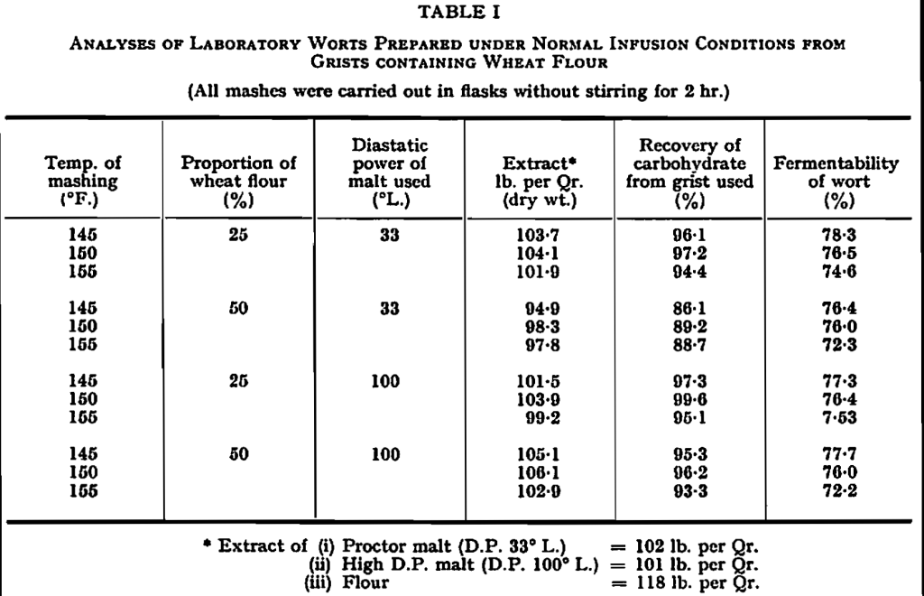 (c) The use of malts of very high diastatic power improved the yield of extract. However, in the case of grists containing 25% of wheat flour, which for the most part gave sufficient yields of extract, this improvement was relatively unimportant, while for grists containing 50% of wheat flour, where recoveries of carbohydrate were usually low, it was scarcely adequate.