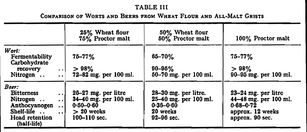 In Table III, typical analyses of the worts and beers obtained from the foregoing brews are compared with those obtained in respect of all-malt grists brewed under identical conditions. It is noteworthy that the beers made from wheat flour are superior to those from all-malt grists, particularly with regard to shelf-life and foam characteristics. The improvement in shelf-life is perhaps related to the relatively low amounts of both nitrogenous and polyphenolic materials, while it is likely that the flour contributes some head-forming substances which are not present in malt. It will be seen, moreover, that the beers made from wheat flour contain rather more hop bitter substances than do those from all-malt grists brewed at the same hop rate. This effect may also be due to the relatively low contents of nitrogen in the worts. With regard to flavour, it has been established—from a series of ranking tests in which the trial beers were compared with commercial pale ales by tasters of a wide range of experience;—that the wheat-flour beers fall well within the commercial range.